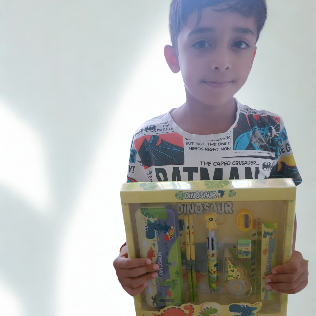 RREBA Dinosaur Stationery Gift Set for Kids – Pencil Box, Pencils, Sharpener, Eraser, Pen, Ruler & Tape | Return Gift for Boys & Girls (Age 3–10)